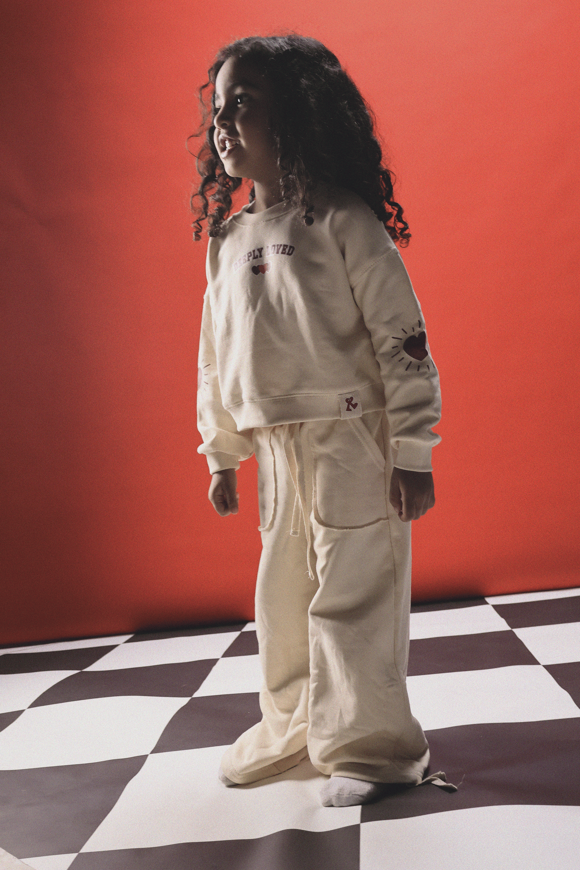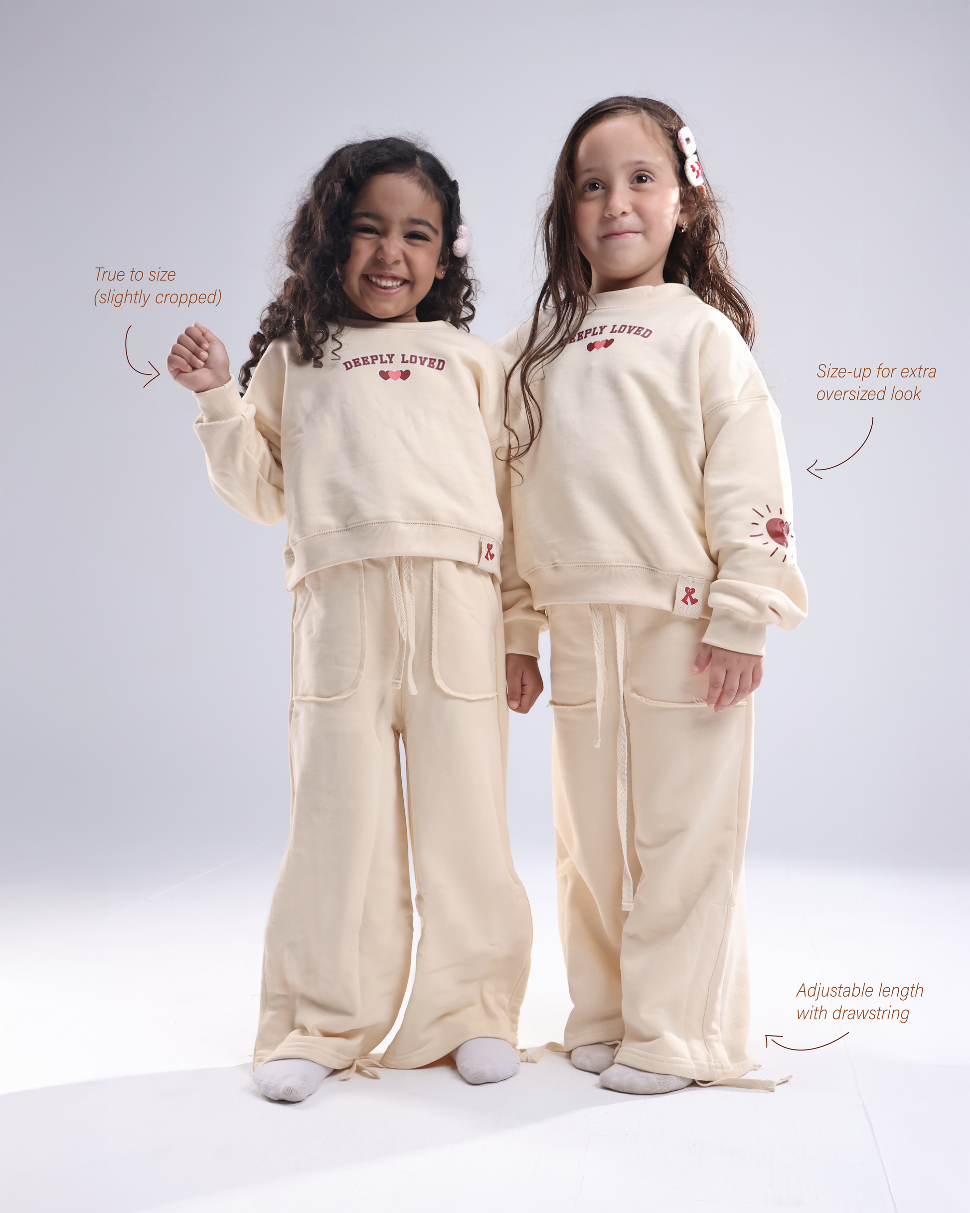 A cozy set made from 100% cotton French terry, designed for comfort, movement, and everyday wear. The sweatshirt carries “deeply loved” — a reminder little ones always need, with soft wide-leg pants that feel easy, breathable, and gentle on the skin.